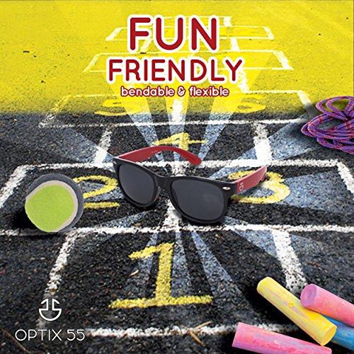 Product Description When it's time to head outdoors you want to make sure your little one is protected from the sun's harsh UV rays in comfort and adorable style with Optix 55's Flexible Polarized Sunglasses. These sunglasses offer full UV protection, allowing your child to enjoy hours of fun in the sun without hurting their delicate eyes. Our glasses are made from flexible silicone gel that is extremely flexible, making them resistant to breakage and perfect for high impact activities. About This Product: ? Flexible Bendable Silicone Gel Frame ? UV Ray Protection ? Plastic Smoke Colored Polarized Lenses ? High Quality Durable Construction ? Assorted Colors Styles ? Ages: 3-10 ? Perfect For Sport and High Impact Activities Optix 55 is committed to providing you and your family with quality eyewear that doesn't sacrifice style. The seemingly endless color combinations make it impossible not to find the right pair for everyone. Choose from daring, bold, fun, casual and classic styles that will satisfy children of different tastes. Optix 55'S FLEXIBLE KIDS SUNGLASSES PROTECT YOUR LITTLE ONE FROM THE SUN'S GLARE HARMFUL UV RAYS Our sunglasses also make outdoor activities easier for your child. They feature polarized lenses that reduce glare and make images appear sharper and clearer, increasing visual clarity and comfort. They're unisex, making them perfect for boys and girls and fit most face sizes. The wide variety of color combinations, shades and the high quality performance of these glasses make them the perfect gift for just about any kid and are especially great additions to gift bags at parties! When you want to enjoy a little fun in the sun, Optix 55 has you covered! 0