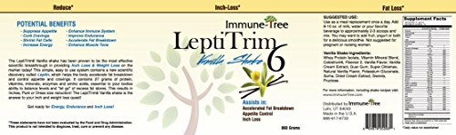 ReleaseDate : 2017-04-17 Studio : Immune Tree Publisher : Immune Tree Binding : Health and Beauty Product Description Immune Tree LeptiTrim6 Vanilla Shake 860 g is another tasty tool in your war chest for long-term, successful inch loss. Mix two to three scoops in 8-10 oz. of water, milk, or your favorite liquid. Or blend it with frozen fruits and create your very own smoothie 0