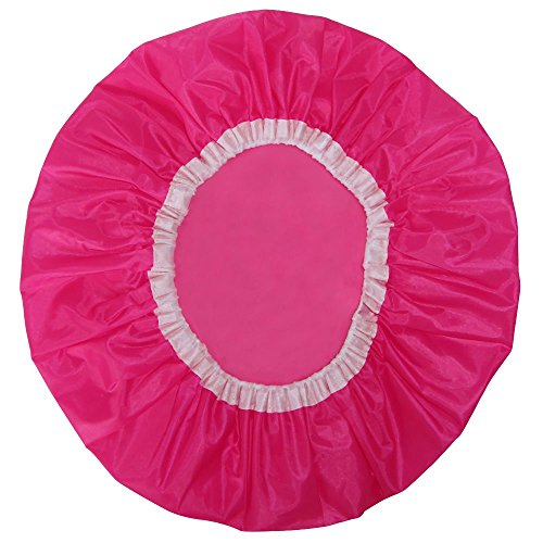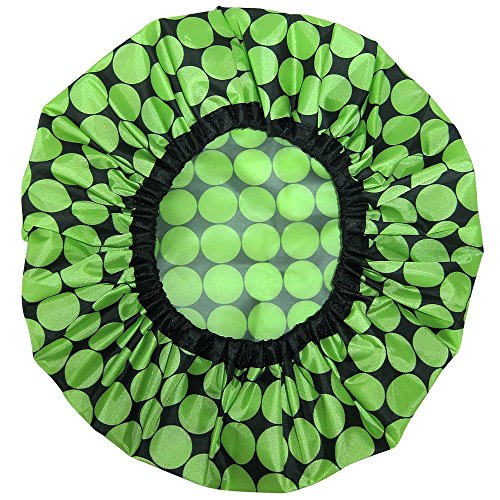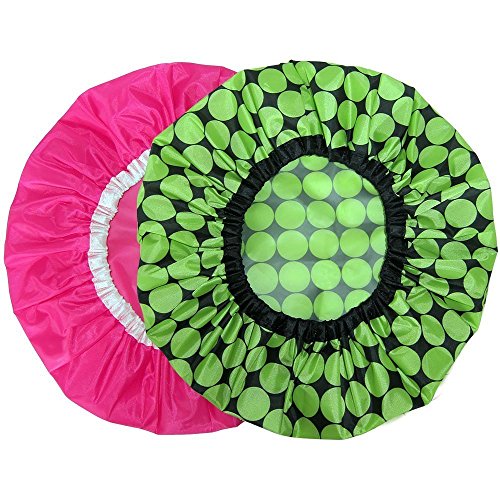 Grace & Company premium lightweight shower caps are made from 100% waterproof breathable performance fabric. Our shower caps are mildew and mold resistant, washable and double layer with an eco-friendly EVA lining. Each shower cap is 18 inches in diameter and fits most hair lengths and head sizes. They feature a comfortable snug flexiband for a super secure fit that keeps water and moisture out and your hair dry. Also perfect as a bath cap or conditioning cap. Package includes 2 stylish shower caps - 1 lime green and black polka dot and 1 magenta design from our Dahlia Collection. Shower in style today!Feature