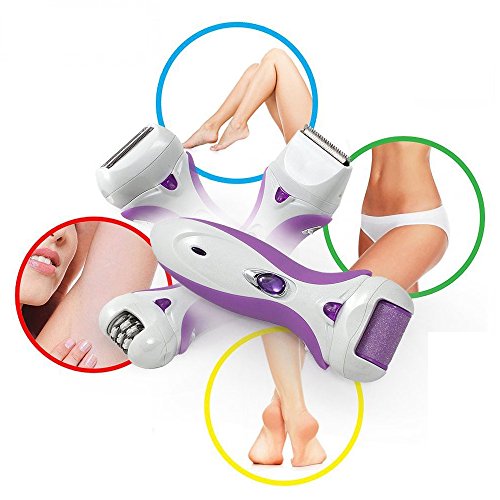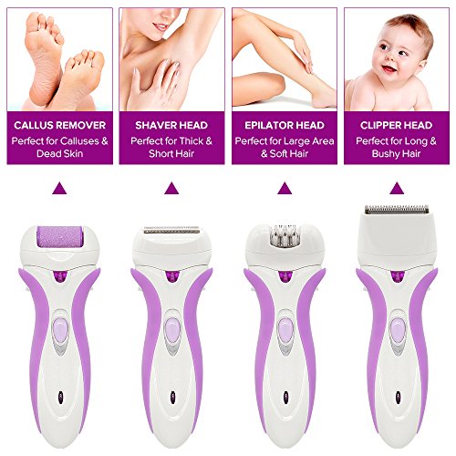 - ▶MULTI-FUNCTION&COST-EFFECTIVE: this 4 in 1 epilator have 4 replacement head: 1pcs pumice stones head, 1pcs shaver head; 1pcs epilator head; and 1pcs hair clipper head. You can buy one, and enjoy 4 kinds of functions.