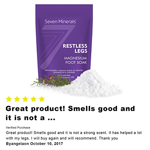 - MANUFACTURED IN USA - 100% MONEY BACK GUARANTEE: Thank you for purchasing Restless Legs Magnesium Foot Soak boosted with USDA Organic Essential Oils. We can’t wait for you to experience the leg relief you deserve. If for some unique reason you’re not satisfied, simply contact us for return or replacement. Order Now