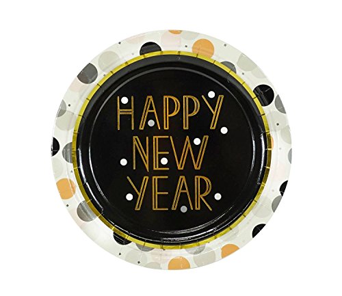 Two 10-ct Dinner Plates: "Happy New Year" - 9" diameter black disposable paper plates.