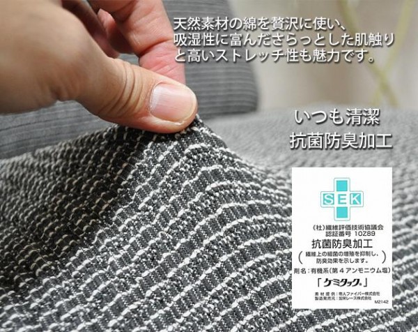 他のソファカバーと一線を画す純国内生産のハイクオリティ仕上げ!「やわらかい素材感」「フィット感」「機能性」「高品質」にとことんこだわった日本製ストレッチニットのフィット式ソファカバー。ソファの張り生地のような雰囲気の合わせやすいボーダー柄で大好評!着脱も女性ひとりでもできる手軽さで、家庭洗濯もできるのでお手入れがとても簡単なのもポイントです。抗菌防臭加工が施してあり、いつでも清潔にご使用頂けます。 |