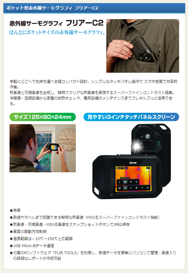 赤外線サーモグラフィー(熱画像装置) コンパクト/ポケットサイズ スーパーファインコントラスト搭載 フリアーC2