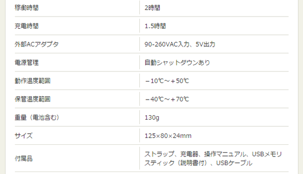 ・保存メディア:内蔵メモリ(画像約500枚)