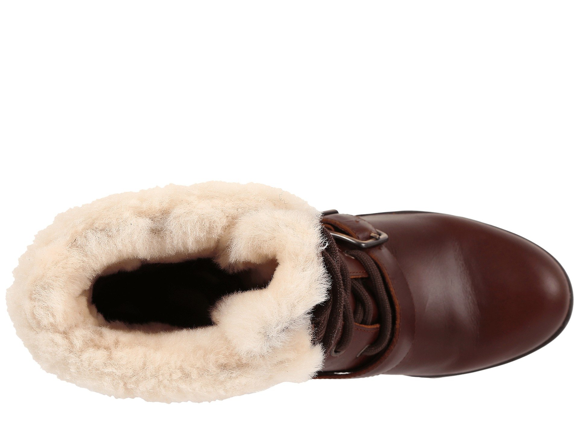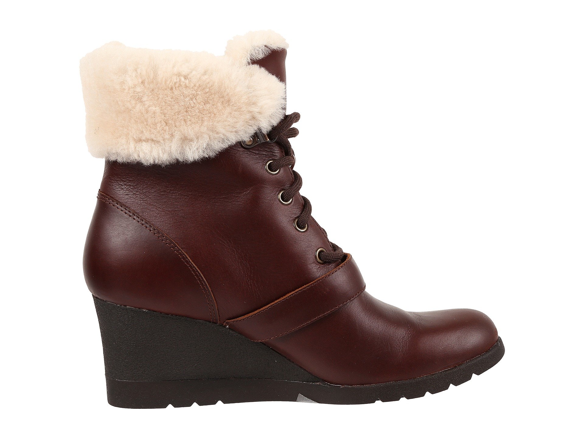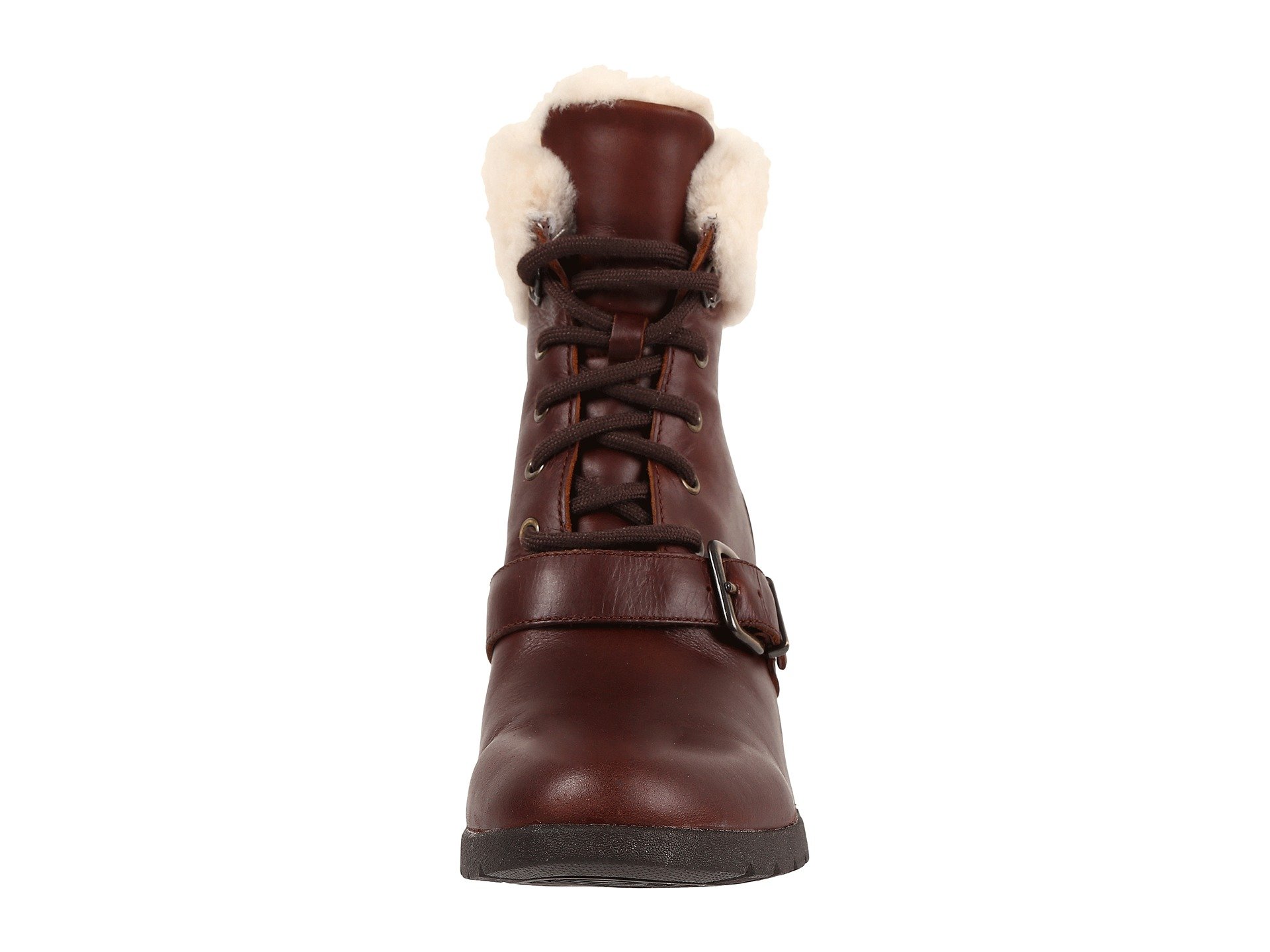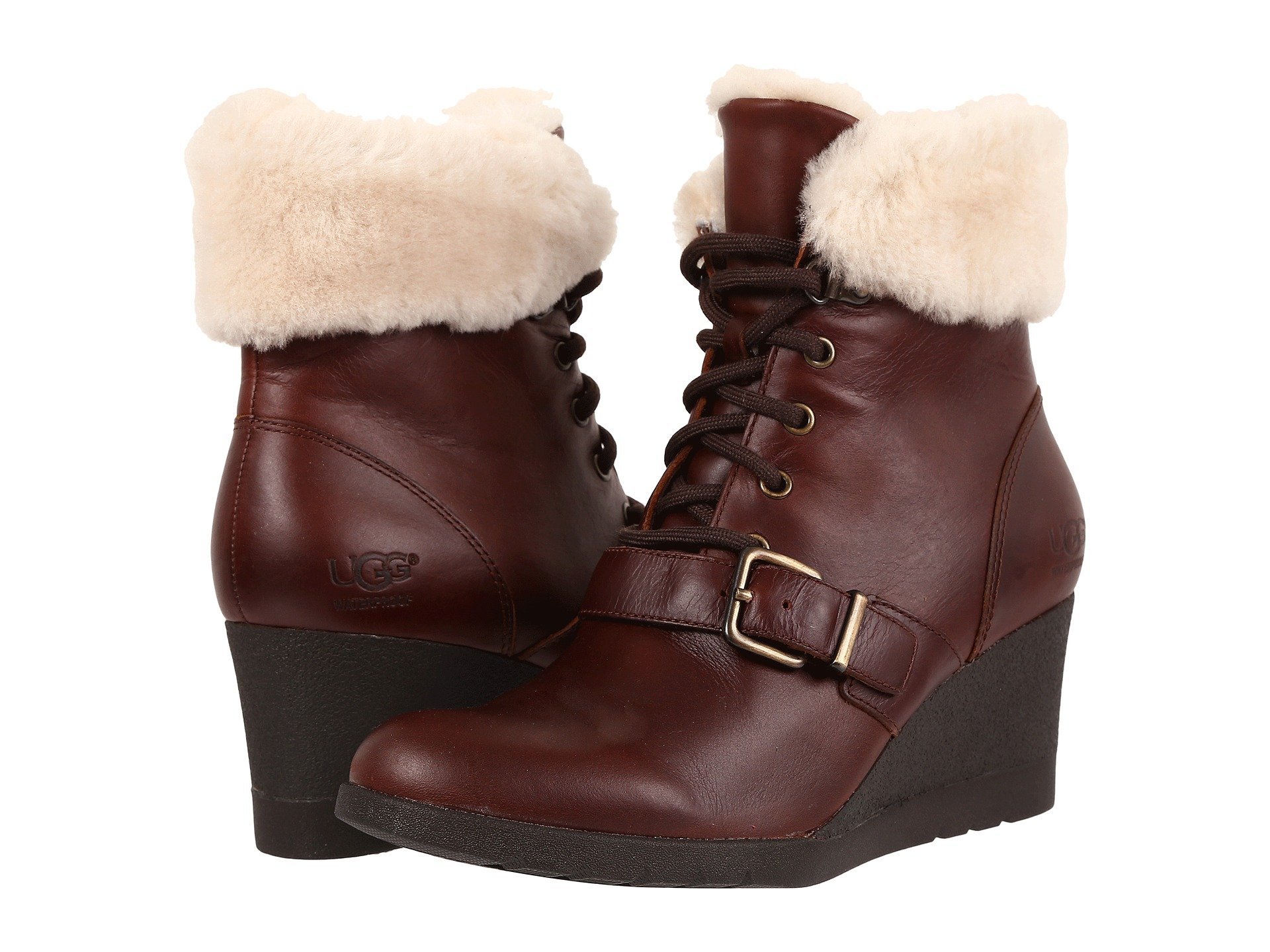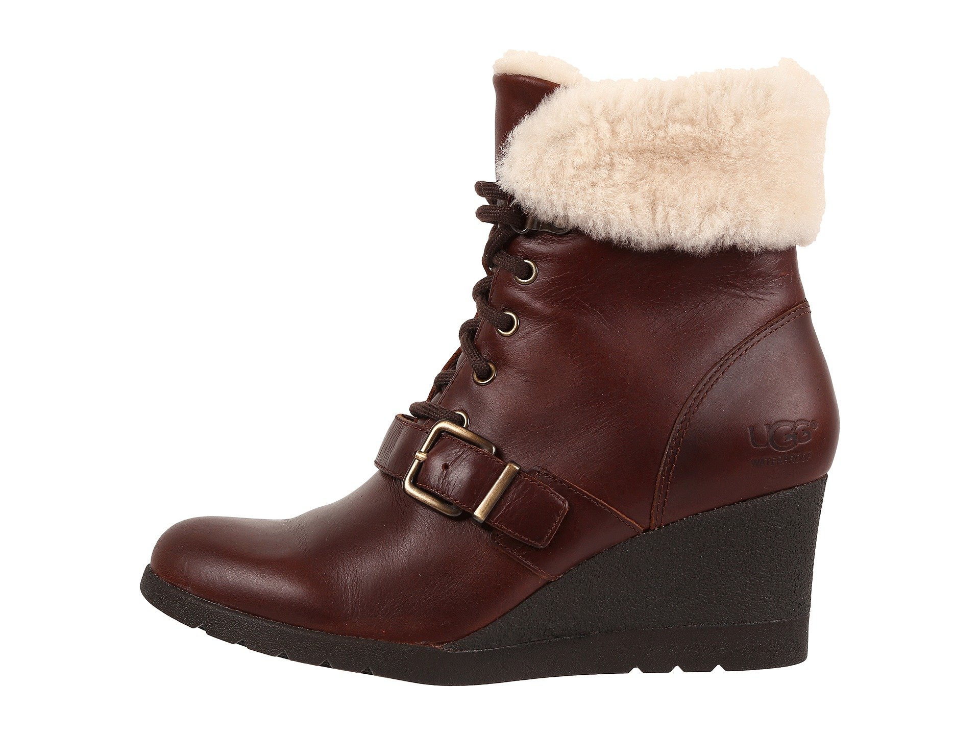 | Product Information SKU: #8725809This item is subject to quantity limitations.Get your winter wandering under way in the UGG? Janney bootie.Waterproof leather upper with sheepskin cuff and tongue. Lace-up closure with adjustable buckle strap for optimal fit. Brushed twill lining. UGGpure™ wool insole and heel lining.Reflective insole with Thinsulate™. Wedge heel.Spider Rubber outsole.Imported.Real sheep fur or lamb has been artificially dyed and treated. Fur origin: Australia, European Union or United States.Product measurements were taken using size 7, width B - Medium. Please note that measurements may vary by size.Measurements: Heel Height: 2 1?4 in Weight: 1 lb Shaft: 6 1?2 in |