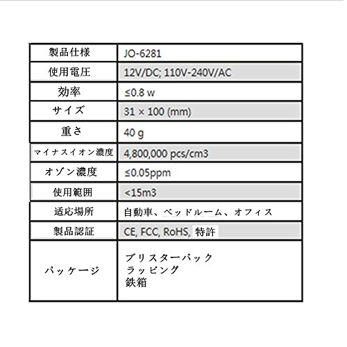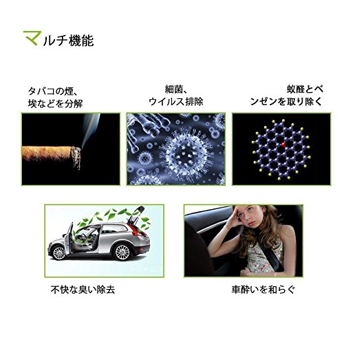 -. Feature : サイズがコンパクトなので、持ち運びに便利です。 / 空気浄化、煙と埃の除去を行いますので、喫煙者の方や花粉アレルギーのお客様たちにはおすすめです。 / シガーソケットに差し込むだけの簡単設置の車内の空気を清浄してくれる空気清浄機です。使用寿命は3~5年! / 製品認証:CEマーク(欧州の適合マークで、健康、安全、環境保全に関する欧州の規定すべてに適合している製品に貼付される)、FCC(米国連邦通信委員会)、RoHS(電気・電子機器における特定有害物質の使用制限に関する指令)。 / 本製品はオンオフといったボタンはなくてシガーソケットにさすだけで動作してくれて動作中は青いLEDが光っておしゃれなインテリアになります。