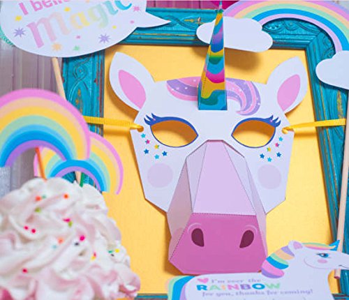 1,A set of accessories including:. 1pcs Unicorn flags (cloud + color),1pcs Unicorn masks,1pcs background cards,1pcs cake topper ,6pcs Unicorn Cupcake Wrappers+6pcs cupcake topper ,6pcs Rainbow Cupcake Wrappers+6pcs cupcake topper ,12pcs thank you note,12pcs mineral water bottle stickers,6pcs Unicorn crayon holder,12pcs names posted,2pcs balloons above the accessories,12pcs Photo booth Props