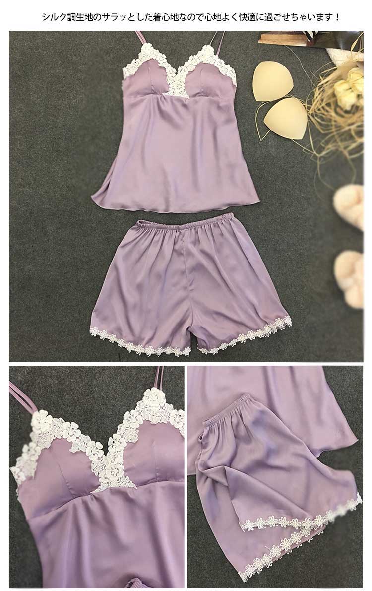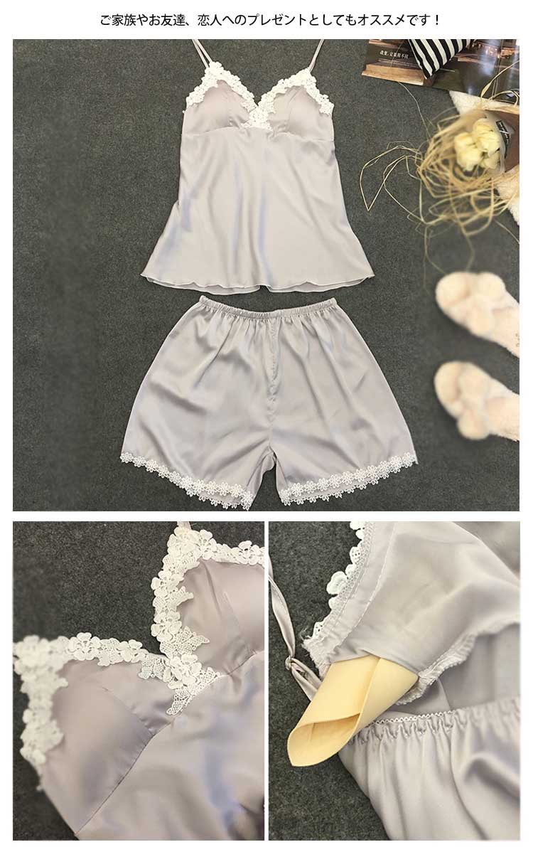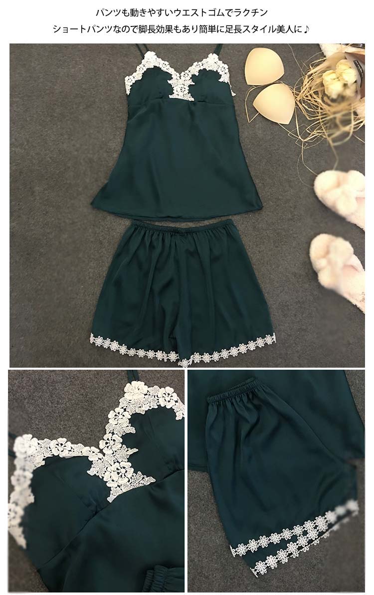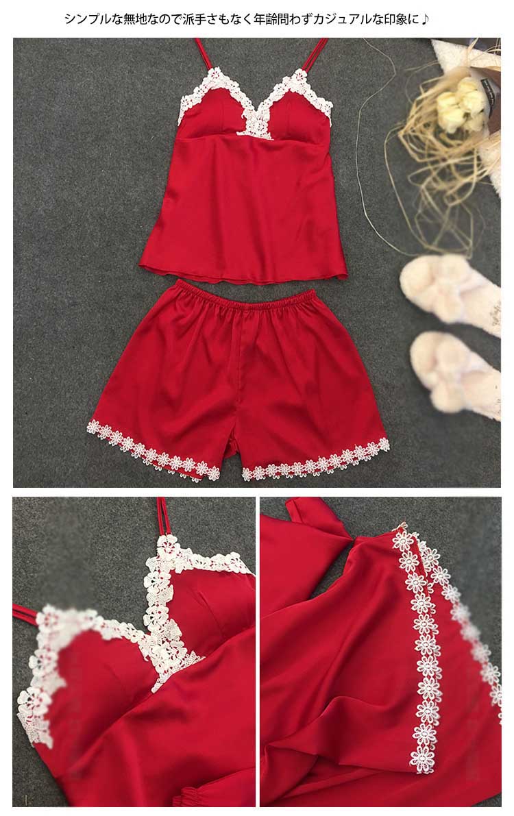 | 可愛いレース使いセットアップルームウエアが新登場♪夏にぴったりなキャミ+短パンセットアップルームウェアです。シンプルな無地なので派手さもなく年齢問わずカジュアルな印象に♪パンツも動きやすいウエストゴムでラクチンショートパンツなので脚長効果もあり簡単に足長スタイル美人に♪シルク調生地のサラッとした着心地なので心地よく快適に過ごせちゃいます!ご家族やお友達、恋人へのプレゼントとしてもオススメです! | |