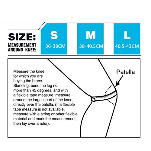 -. Feature : Size: 3 sizes, S(36 - 38cm), M(38 - 40.5cm), L(40.5 - 43.5cm).Measure the knee for which you are buying the brace. Standing, bend the leg no more than 45 degrees, and with a flexible tape measure, measure around the largest part of the knee, directly over the patella / Effective Support For Knee. For severe athletic, physical strain, helping relieve knee injuries, worn joints(gonarthrosis), slight joint instability, chronic joint pain and swelling / Features: Skin-friendly, temperature-regulating, new cellular fabrics, highly breathable, high-grade Velcro, protection pad / Special Design. Open patella design relieves stress in the knee area and the reinforced patella stabilizer prevents displacement of the support wrap and guides the kneecap into proper motion. Fully adjustable 3 strap closure allows users to find the perfect fit and avoid slipping during even the most active motions. / Intended Use. This item is manufactured for P.R.Ivate use and may not be worn longer than 2-3 hours non-stop as well as longer than 6 - 8 hours daily.