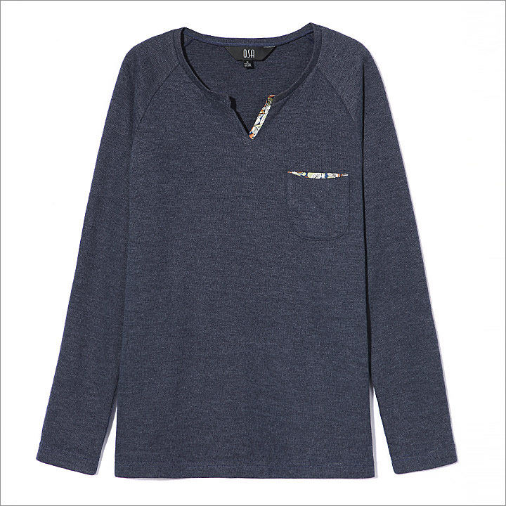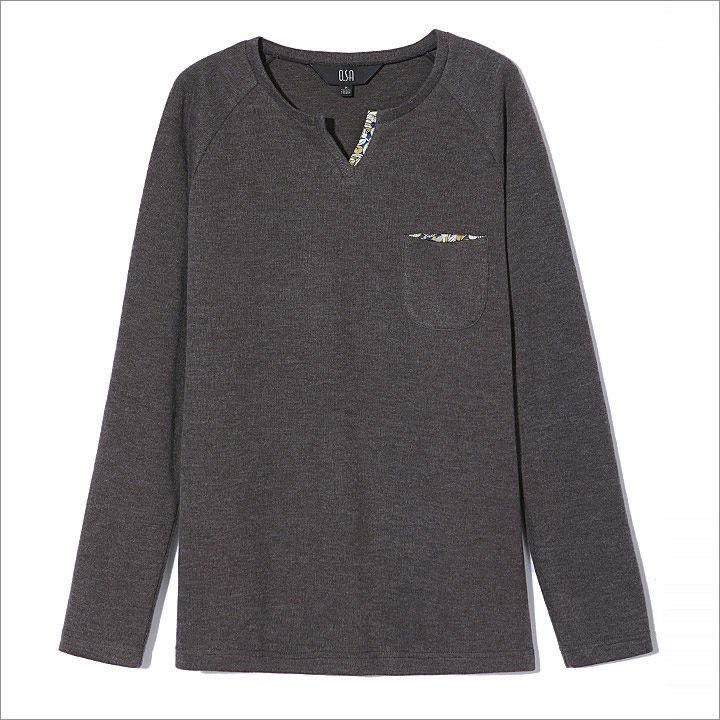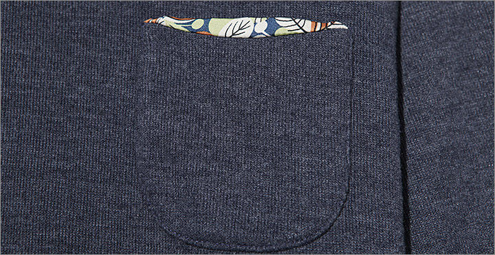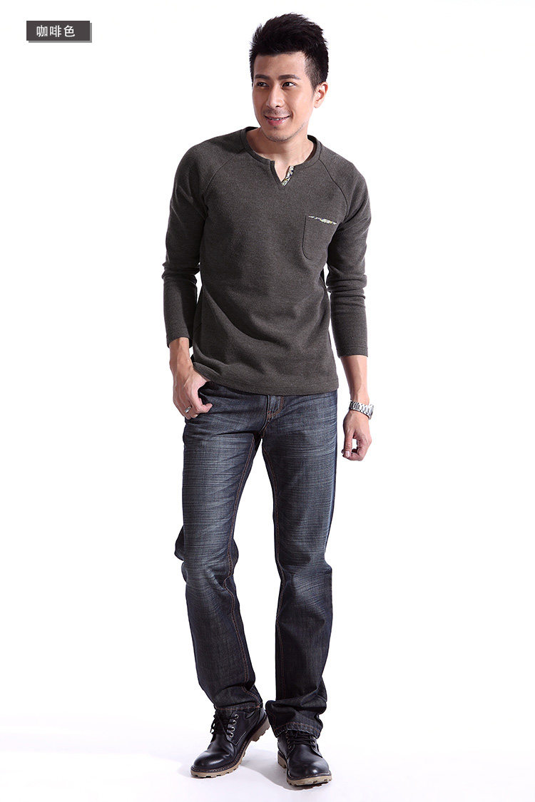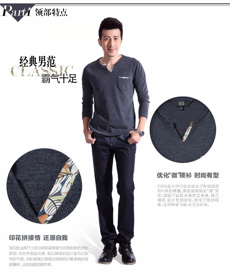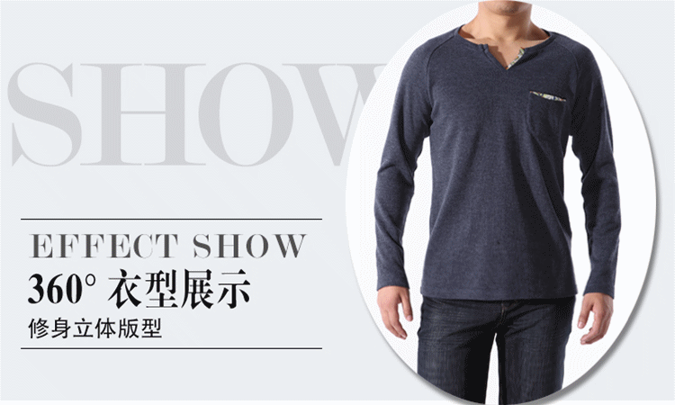 T恤廓形简洁大气。采用插肩袖的设计,休闲中透露出时尚绅士味,领子的设计较为讲究。结合了圆领和v领的精髓,既能体现出男性的魅力,又不至于太过张扬,具备圆领的朴实百搭特性。领子的v字部分,其中一边及袋子的里布,采用了花式面料拼接,缎面雪纺在男士服饰中极少出现,这样的款式更微露出丝感温柔。