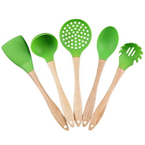 -. Feature : Upgrade your kitchen by adding the unique style to your tools with silicone wood handle utensil set and the bright green color. This incredible set help you be a professional chef step by step and you won't want to use anything else! Excellent gift for family friends students and new homeowners. / Perfect 5 piece utensil set: great choice for food preparation and cooking tasks such as baking grilling stirring basting. Ideal for all of your culinary and cookware needs suitable for home schools restaurants hospital party cooking. / Safe & heat resistant: FDA approved food-grade and BPA free hygienic design with silicone heads no seams to hide bacteria. Heat resisting property up to 500 degree F/260 degree C, never worry about overheating or melting into pan. / Cookware protector: designed for non-stick cookware won't scratch your expensive pots and pans. Our silicone utensils is no way to crack or break with durable silicone construction. / Very easy to clean & store: they can be easily cleaned with tap water. The ergonomic wood grip handle allows maximum comfort to handle; every piece comes with a hanging hole to store and keep your items safe.