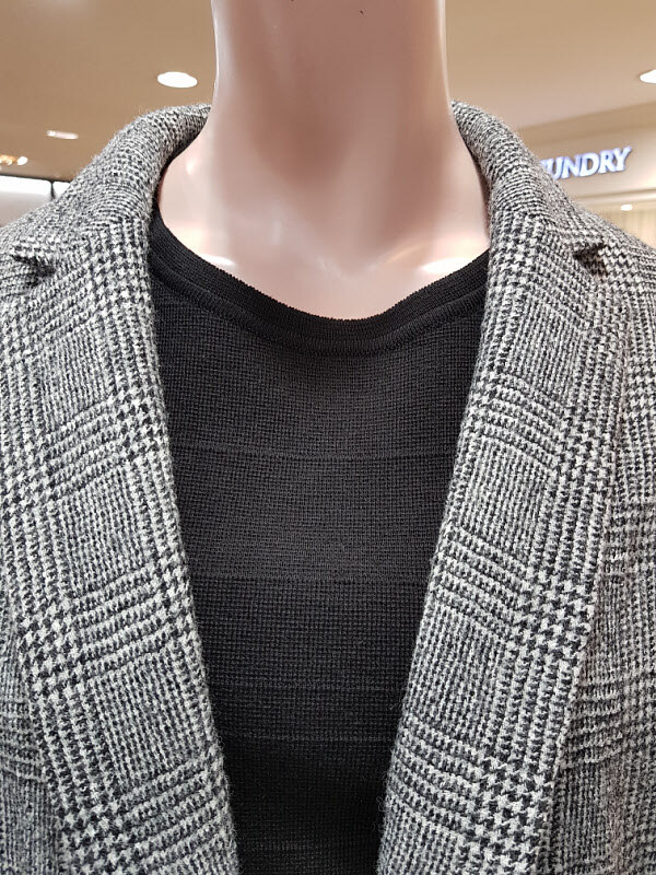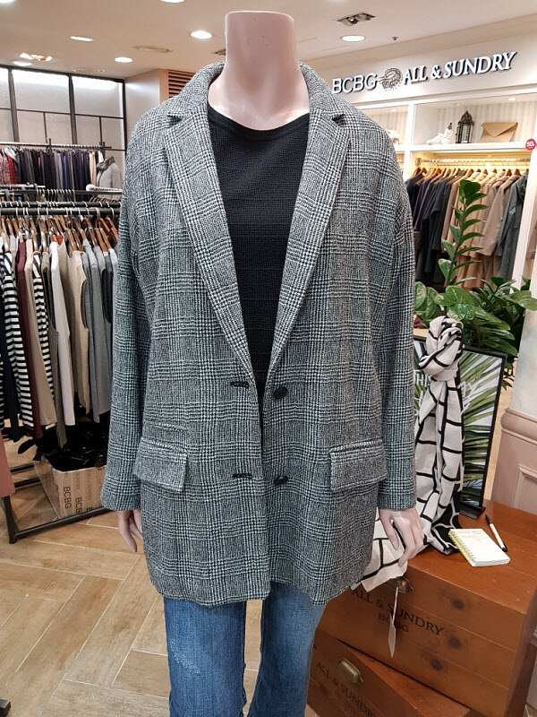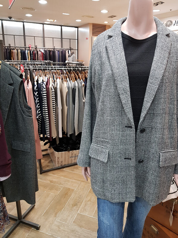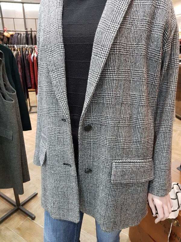 박시한 오브라인의 모직자켓이예요두기지칼라인데 그레이체크랑 검정색 무지자켓 두가지종류예요착용감이 너무 가벼워서 티셔츠 한개입은 느낌이라서 깜짝놀라실거예요지금 체크자켓은 몇장안남았네요^^