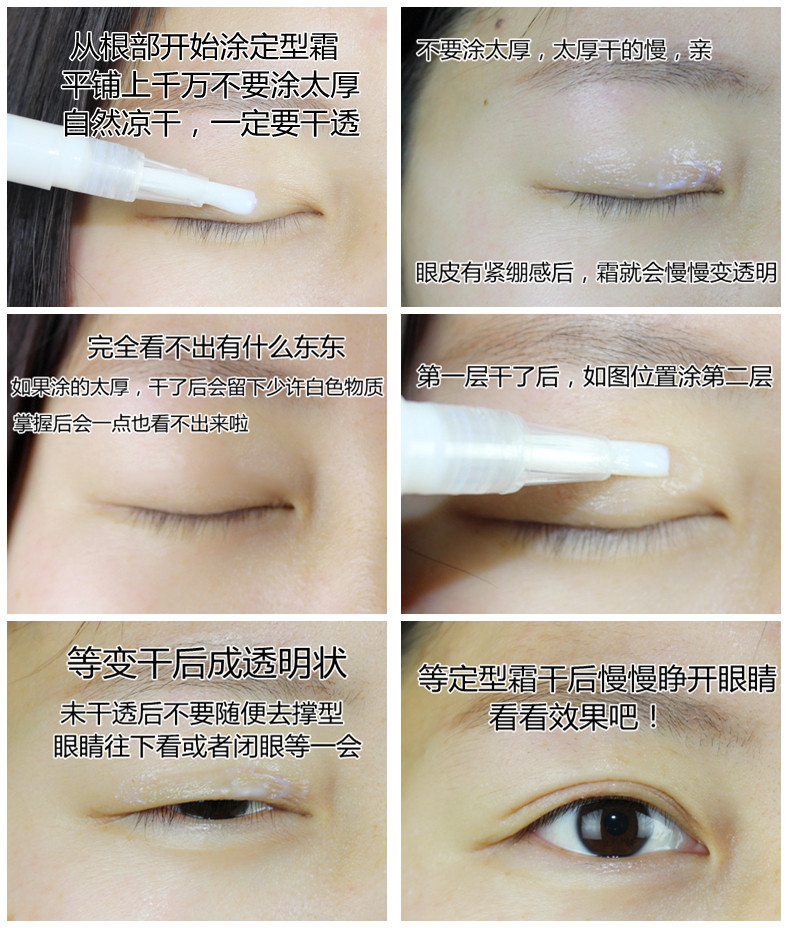 Apply skills: must not be too thin or too thick, too thin white coating will play,but also do not hold up, there is a when coated coating time is too long, the side of the coated cream dry side, that will also appear white slag andpeeling phenomenon, the coating is too thick, will have the obvious point,every time the amount should be moderate. And everyone's eyelids are not the same, some people will be easier to forming the eyelids, but some people will use some skills to molding, don't think for the first time, can be successful, for some people, this is not possible, the first use is to tryseveral times before they know how to make use of them in time, dearpainted the first layer opened his eyes have a look have no shape, withoutforming that we should think of Is it right? Coated thick enough, or is not wide enough, thick enough to add layer, not wide enough to add a bit width,to think more about the cause, not a successful drop, like dear first time to buy a double fold eyelid back when the paste to believe we will not first willuse.