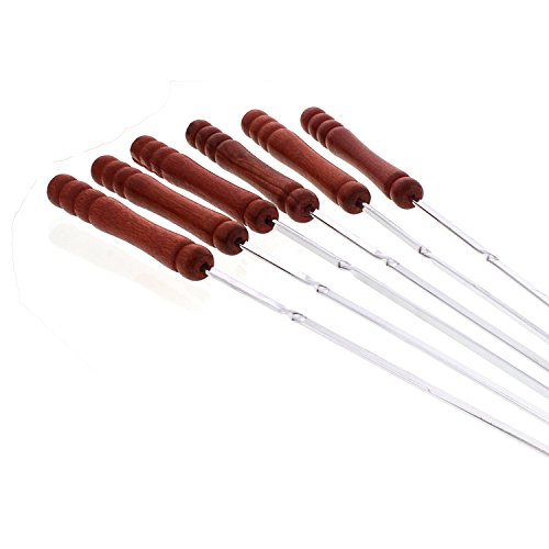 Studio : Cheftor Publisher : Cheftor Product Description This set of 6 premium stainless steel needle wood handle BBQ skewers are great for Shish Kebab, turkish grills koubideh, brazilian-style BBQ and More! They feature a wood handle which increases grip and stays cool during use for safe handling.