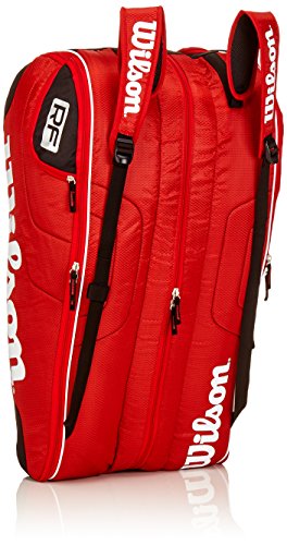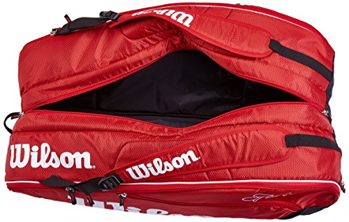 Wilson Federer Team III 12-Pack Red Tennis Bag. The Wilson Federer Team III 12-Pack Red Tennis Bag is the perfect choice for serious players looking to take their game to the next level. Holds up to 12 rackets. Features large and small accessory pockets, and a large compartment. Dimensions: 29.52 x 13.38 x 13.77 in. MFG#: WRZ833612.