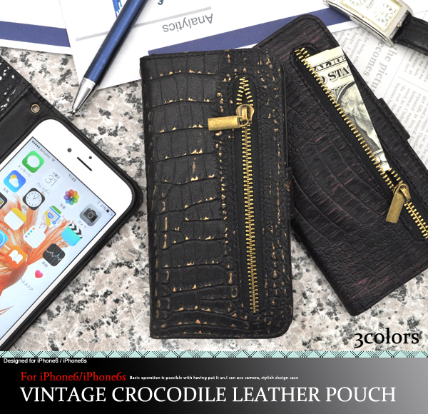 iPhone6/iPhone6s用ヴィンテージクロコダイルレザーデザインスタンドケースポーチ