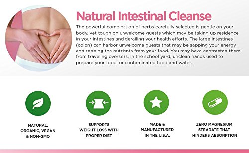 The powerful combination of herbs has been carefully selected to be gentle on your body, yet effective on assisting with your health efforts. All of the natural ingredients in Max Strength, Intestinal Cleanse have a critical purpose: ? Helps to naturally restore your energy levels* ? Rejuvenates, soothes and nourishes the intestinal tract* ? Diminish the need for instant gratification foods, including sugar and carbs*