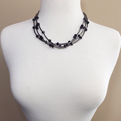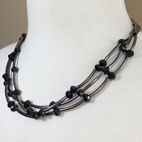 3 Row Layered Glass & Curved Tube Beads Necklace and Earrings Set (Black & Gun Metal)