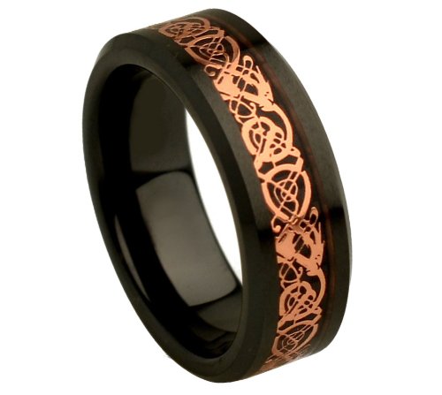 -. Title : Black Ceramic High Polish & Rose Gold Plated Celtic Dragon Inlay Wedding Ring
