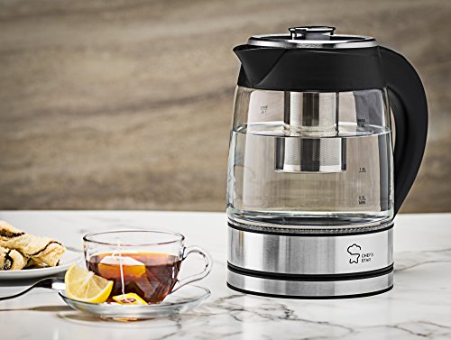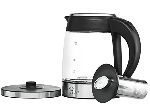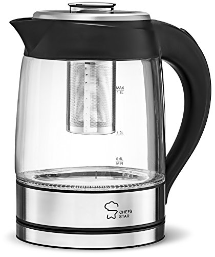 Chef's Star Brosilicate Glass Kettle With Stainless Steel Tea Infuser rapidly boils up to 1.8 liters of water. This sleek electric kettle boils water faster than the stove or microwave. Filling and cleaning this kettle is super easy. By lifting the kettle from the corded base, you can easily fill the kettle with water. The clear glass with its water-level indicator lets you view the exact water level. The modern soft blue LED illumination in the glass kettle signals when the kettle is boiling and conveniently shuts off once the water is boiled so the kettle never boils dry or overheats. Fine mesh built-in filter strains water so you get a smooth cup of coffee and tea. This Chef's Star Brosilicate Glass Kettle is made from the finest durable brosilicate glass from quality craftsmanship. It is compact, space-saving and looks great on any kitchen counter.