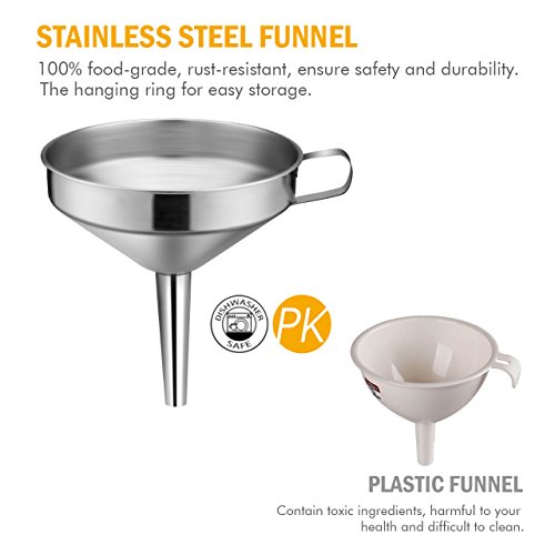 -. Feature : 3 SIZES,1 STRAINER INCLUDED: 3 pieces funnel set includes 4"/10.4cm, 4.9"/12.5cm and 5.6"/14.2cm diameter of the month for your different needs. One removable strainer is included helping prevent clogging of the stem. / DURABLE STAINLESS STEEL: These strainer funnel are made of high quality stainless steel to ensure safety and durability. Much better than plastic ones which take on the color and odor of some ingredients. The side ergonomic handle helps conveniently hold the funnel over a jar, pot etc. / MULTI-PURPOSES: the funnel with strainer perfect for transporting liquids quickly & accurately. It also can be used to sift dry ingredients like flour, salt, sugar, spices etc. / EASY TO CLEAN & STORE: stainless funnel set nests to save space, the ergonomic handle for hanging in your kitchen cabinets. It is easy to clean up after use. Just put it into dishwasher or simply wash with soapy water. / 100% MONEY-BACK GUARANTEE: This set of funnels with a filter is definitely a smart choice for you. Buy it with confidence. If you are not satisfied with it, you could return them for a full refund within 45 days. And we provide 12-MONTH WORRY-FREE WARRANTY.