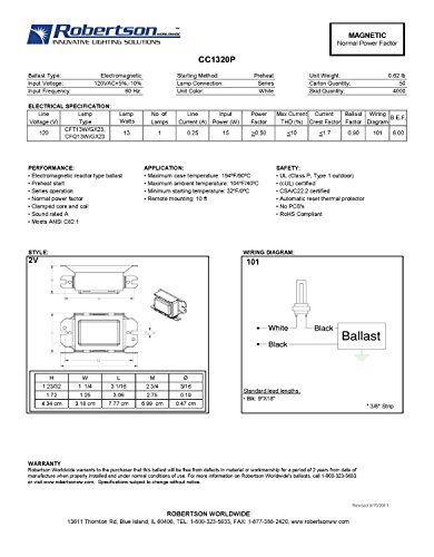 ROBERTSON 3P10160 CC1320P Fluorescent mBallast for 1 CFT13 or CFQ13W/GX23 CFL Lamp, Preheat Start, 120Vac, 60Hz, Normal Ballast Factor, NPF