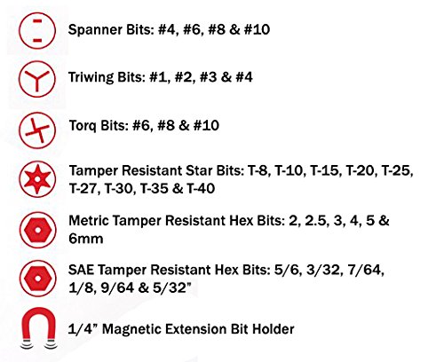 - WHAT YOU GET: (1) Magnetic Extension Bit Holder (3) Torq bit sizes: 6mm, 8mm, 10mm; (4) Spanner bit sizes: 4, 6, 8, 10mm (4) Tri-Wing bit sizes: #1, #2, #3, #4; (6) SAE Hex bit sizes: 5/32″, 9/64″, 1/8″, 7/64″, 3/32″, 5/6" (6) Metric bit sizes: 2mm, 2.5mm, 3mm, 4mm, 5mm, 6mm; (9) Torx bit sizes: T8, T10, T15, T20, T25, T27, T30, T35, & T40
