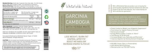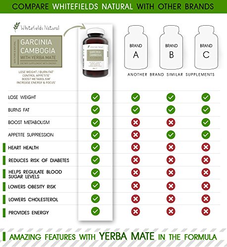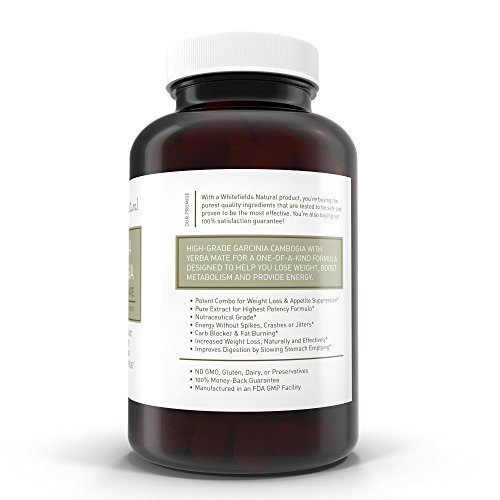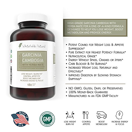 -. Binding : Health and Beauty -. Brand : Whitefields Natural -. EAN : 0608807999093 -. Feature : Highly Effective: Garcinia Cambogia Extract improves metabolism, burns fat, and curbs appetite, allowing you to naturally reach your weight loss goals. Serving size of 2 capsules / Boost Energy: Capsules are formulated with Yerba Mate, which provides long lasting natural energy without crashes, spikes, or jitters. It also increases mental focus, perfect for long days at the office or even at home / Potent Active Ingredient: Hydroxycitric acid (HCA) delivers fat burning results by working in two ways. It starts by suppressing your appetite, and then stops the fat generating process by blocking the enzyme that creates fat from carbs / Premium Ingredients: Non-GMO formula and vegetarian capsules are proudly made in the USA, and are free from any gluten, preservatives, and dairy / No Side Effects: Clinically tested to be safe to incorporate into your daily diet and exercise routine -. IsAdultProduct : 0 -. Label : Whitefields Natural -. Manufacturer : Whitefields Natural -. MPN : 3002270001 -. PackageQuantity : 1 -. PartNumber : 3002270001 -. ProductGroup : Health and Beauty -. ProductTypeName : HEALTH_PERSONAL_CARE -. Publisher : Whitefields Natural -. Studio : Whitefields Natural -. Title : 100% Pure Garcinia Cambogia & ENERGY with Potent Yerba Mate Extract - 180 caps - LOSE WEIGHT & BURN FAT - Boost Metabolism with All-Day Energy -. UPC : 608807999093
