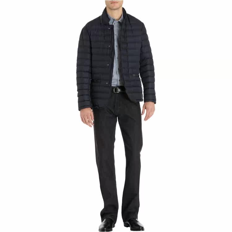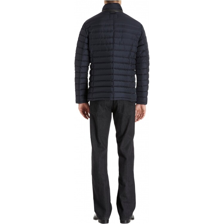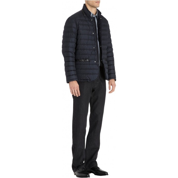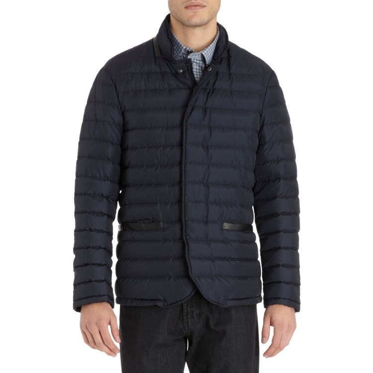 Down-filled quilted puffer blazer jacket with hidden snap placket at zipper front. Leather trim at high collar and front pockets. Lined. Available in Navy. Imported. Nylon/leather. Professional clean.