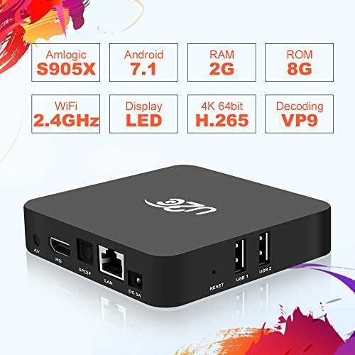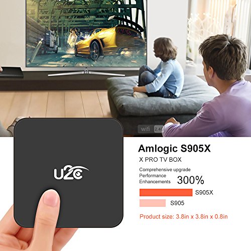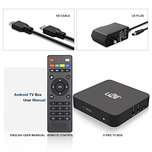 Studio : U2C Publisher : U2C Binding : Electronics Product Description 2017 New Model Android 7.1 Smart TV Box X PRO Amlogic S905X 2GB RAM 8GB ROM Quad Core 64 bit Support 3D 4K H.265 VP9 Media Player Hardware CPU: Amlogic S905X Quad core ARM Cortex-A53@1.5GHz(up to 2.0 GHz) GPU: Penta Core Mali-450 750MHz RAM: 2G DDRIII ROM: 8G eMMC DC In: DC 5V/2A USB Host: 3 High speed USB 2.0 port and 1 OTG port,support U disk , USB HDD and Hard drives TF Card Reader: Maximum Support: 128G(Micro SD Card) Lan: 100M RJ-45 Wifi: 802.11 b/g/n 2.4G WiFi AV In: AV(3 in 1) port SPDIF: Optical SPDIF interface Power Indicator: Power On/Off:Blue/Red LED Display: White light digital display,show time and device connecting information(WIFI,AV,HD,SPDIF) Software O.S.: Android 7.1 Decoder Formats: 4K, H.265, MPEG1/2/4, H.264, HD AVC/VC-1, RM/RMVB, Xvid/DivX3/4/5/6, Real Video 8/9/10 Video Formats: 4K@60fps, H.265, AVI, H.264, VC-1, MPEG-2, MPEG-4, DIVD/DIVX, Real8/9/10, RM,RMVB, PMP, FLV, MP4, M4V , VOB, WMV, 3GP, MKV Music Format: MP1, MP2, MP3, WMA, OGG, AAC, M4A, FLAC, APE, AMR, RA, WAV Photo Format: JPEG/BMP/GIF/PNG/TIFF Languages: English/French/German/Spanish/Italian etc. 24 languages App Functions: Google play store,Amazon alexa,Netflix,Youtube,Facebook,Twitter,Online movies,etc Mouse/ Keyboard: Support mouse and keyboard via USB;Support 2.4GHz wireless mouse and keyboard via 2.4GHz USB dongle Other feature:Free Internet searching,many kinds of games,etc Ports / Interfaces: 3 x USB 1 x OTG 1 x HDMI 1 x Optical SPDIF 1 x RJ-45 Ethernet LAN Port 1 x Micro SD Card Package included: 1 * X pro Android TV Box 1 * Power Adapter (5V 2A ) 1 * Remote Control (AAA batteries sold separately) 1 * User Manual 1 * HD Cable?