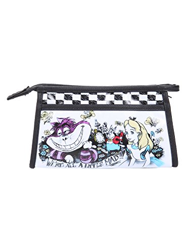 Cosmetic bag from Loungefly with an "We're All A Little Mad" design inspired by Disney's Alice in Wonderland. Cheshire Cat, Clock, White Rabbit, Alice and other themed designs.