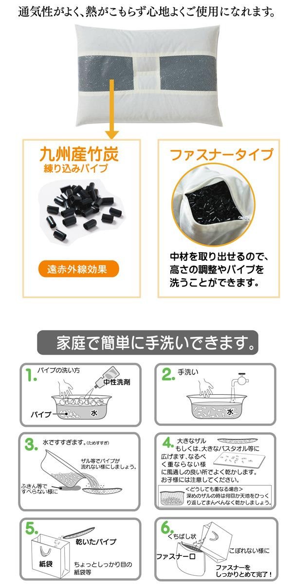 竹の子の産地である、福岡県八女郡立花町産の竹炭を練り込んだパイプを使用しています。パイプ使用のため通気性がよく、熱がこもらず心地よくご使用できます。ファスナー式で中材(パイプ)の交換、高さ(量)の調節が可能です。ご家庭で簡単にパイプが洗えます。 |