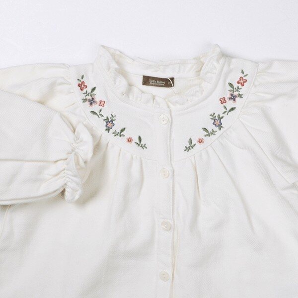 플라워패턴.자수의 프릴 블라우스입니다 총2가지 종류의 블라우스로 밝은 화이트색상은 깔끔한 느낌의 블라우스이고 크림색상은 화려한 플라워패턴으로 같은 제품이지만 다른 느낌의 블라우스입니다-
