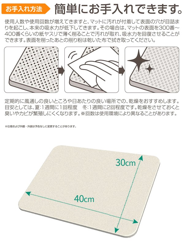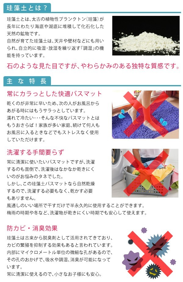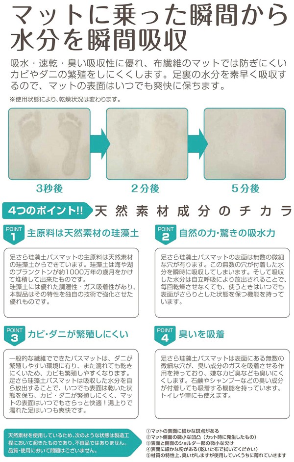 その特性を独自の技術で強化させたのがこの珪藻土バスマットです。