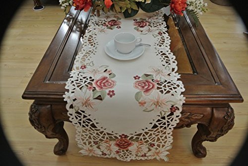 -. Feature : Material;100% polyester:/satin: beautiful embroidered and cut work design table runners Color:Beige: measures: 16 x 36" OB. 16 x 54" OB. 16 x 72" OB. are available now. ; Machine wash,iron on the lowest setting if needed. Matching place mat, table topper and table runner available.