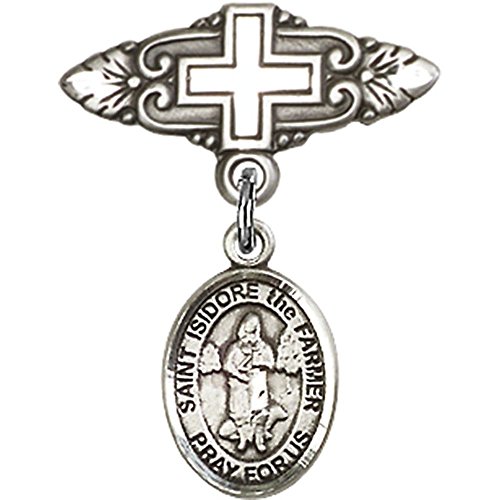 -. Title : Sterling Silver Baby Badge with St. Isidore the Farmer Charm and Badge Pin with Cross 1 X 3/4 inches