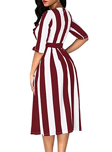 Dokotoo Womens Plus Size 1950s Summer Stripe Belt Half Sleeve High Waist Swing Skater Midi Dresses for Work Wine Large
