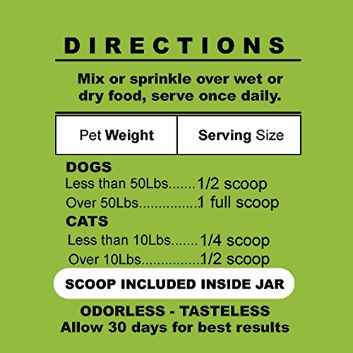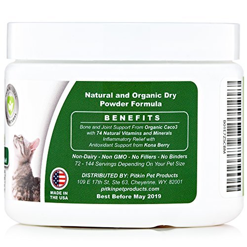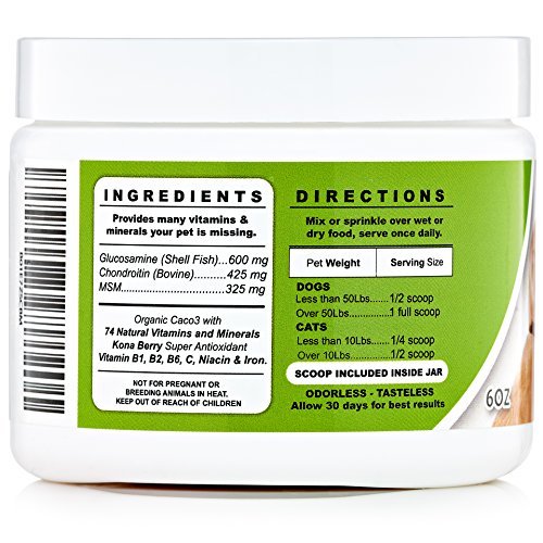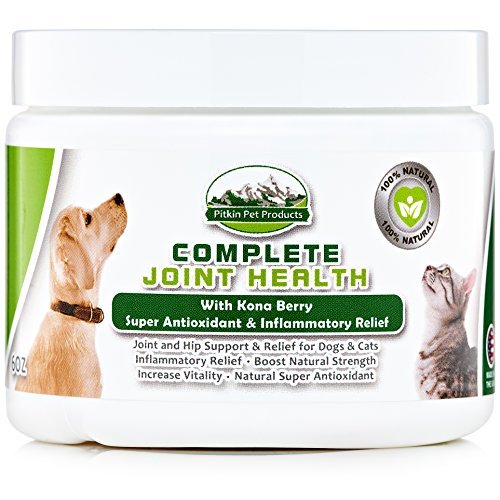 -. Feature : GIVE YOUR PET RELIEF FROM PAINFUL HIP AND JOINT PAIN - Each Dose (1/4 teaspoon) is loaded with Natural and Organic Ingredients that lubricates the joints of your Beloved Pet to make them feel young again. GR8 Pitkin Complete Joint Health reliefs pain from Hip and Joint problems with daily usage. Made At a USA FDA Inspected Facilities GMP Standards & Practices / HEALTHY AND PAIN FREE HIPS AND JOINTS are critical to your dog or cats wellbeing and continuing to enjoy their life to the fullest. Joint problems can have a huge impact on your dog's physical and mental well-being, causing pain and distress. Don't let your best friend suffer joint pain when you can help your dog or cat not to suffer from Hip or joint pain or even arthritis pain relief for dogs and cats. glucosamine chondroitin for dogs is proven to provide relief / PREVENT INVASIVE PROCEDURES AND PAINFUL INJECTIONS: Complete Joint Health will help your dog or cat repair cartilage and improves joint function help reduce inflammation to increase comfort and mobility for dogs with hip dysplasia., saving your dog the pain and recovery time of hip and joint cartilage injuries and avoid invasive surgeries. Avoid the costly shots for Glucosamine given by Vets at time of injury by give your pet just a small dose daily with their food. / NOT JUST FOR OLDER DOGS OR CATS. GR Pitkin Complete Joint Health helps younger pets recover faster from hard play or activity which can cause you dog to limp by helping to protect the joints or hips. Pain free pets are happier pets and will increase longevity of their time with you. YOUR DOG OR CAT WILL ACT LIKE THEIR OLD SELF AGAIN. Give your dogs arthritis relief, made for canine and feline alike. / 100% SAFE NATURAL FORMULA for joint pain and ARTHRITIS pain relief. Glucosamine, Chondroitin and MSM to rebuild cartilage and provide anti-inflammatory pain relief. Our advanced formula includes Kona Berry, A SUPERFOOD, for free radical and inflammation prevention. Packed with vitamins B1, B2, B6, C, Niacin, Iron, Protein, Potassium, Magnesium , Hand picked for optimal health. Organic Caco3 containing 74 natural minerals pets are missing and helps boost natural strength, vitality,and ph levels