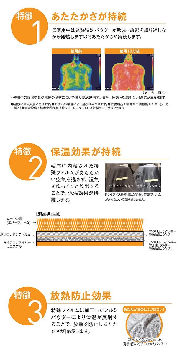 | ご使用と同時に発熱特殊パウダーが吸湿・発熱し、使用中は吸湿・放湿を繰り返しますので、朝まであたたかさが持続します。さらに、内蔵された特殊フィルムのアルミパウダーが体温を熱反射し放熱を防止するので、あたたかさが持続します。 |