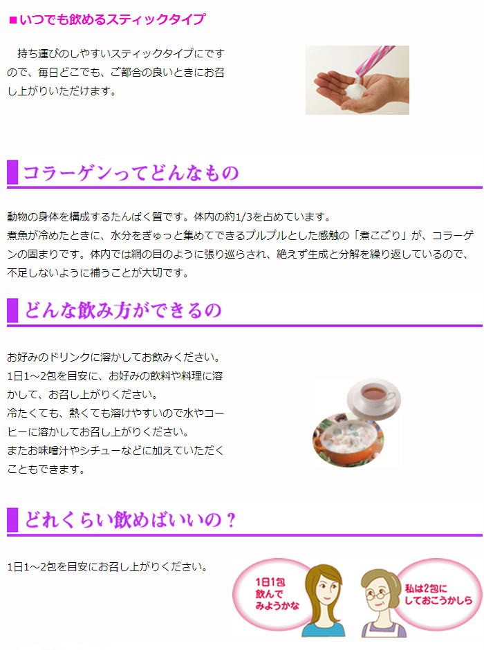 | お召し上がり方 | 1日の摂取目安量 ●1日1包-2包を目安に、お好みの飲料、料理などに溶かしてお召し上がりください。 ●お味噌汁、カレー、シチューなどの料理に入れる場合には、人数分を溶かしてお召し上がりください。 ●温かい飲み物でも、冷たい飲み物でもおいしくお召し上がり頂けます。 |