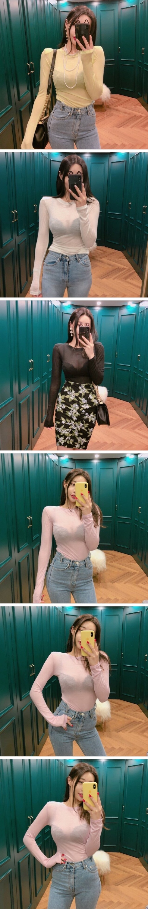 Women`s See-through T-shirts with Shoulder Pads Black White Pink Yellow