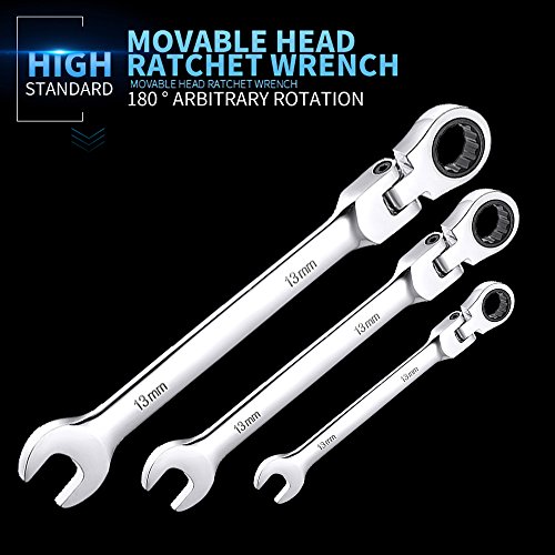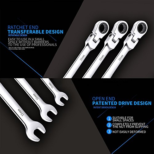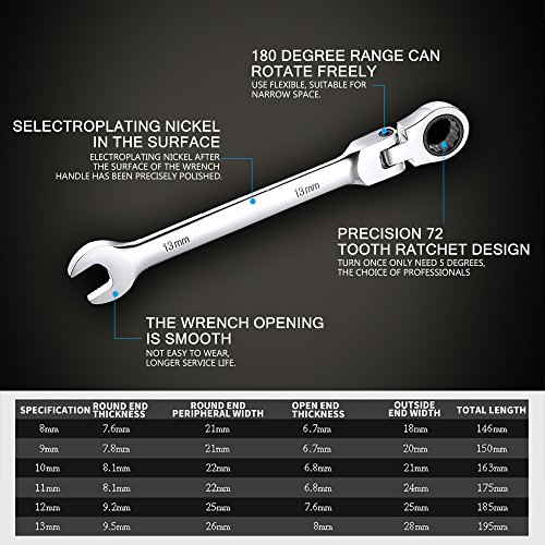 - 5.Flexible head ratchet: 180 degree pivoting head ideal for use in tight, confined areas.