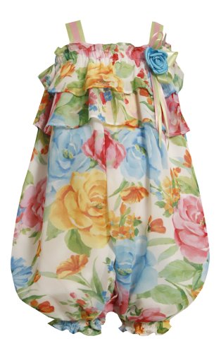 Sleeveless multicolor bold floral print chiffon romper/coverall with ruffle bodcie and rosette trim.