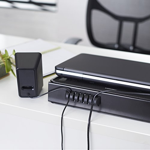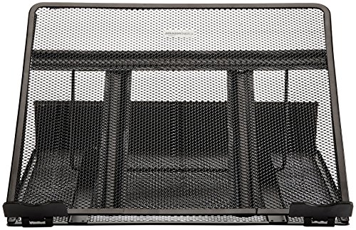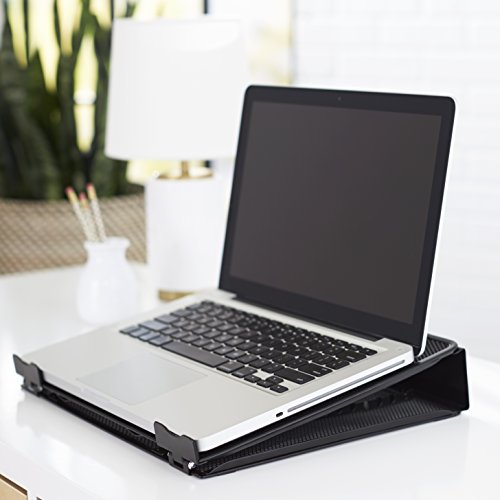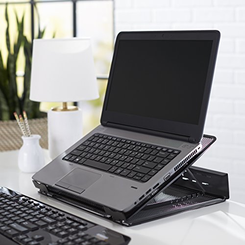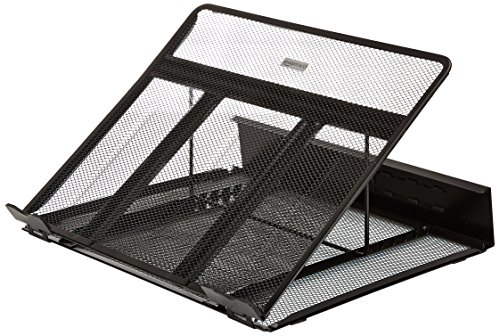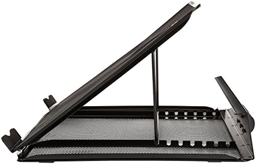 -. Feature : Ventilated laptop stand helps keep laptops running cooler to help reduce crashes / Metal-mesh platform draws heat away from laptop / Adjustable height for increased airflow and comfortable reading and typing; adjustable from 12 to 35 degrees / Cord organizer with 6 slots promotes a tidier desktop / Measures approximately 13 by 11 by 7.2 inches (LxWxH) at max height