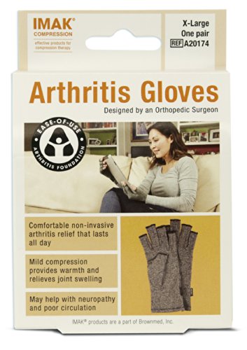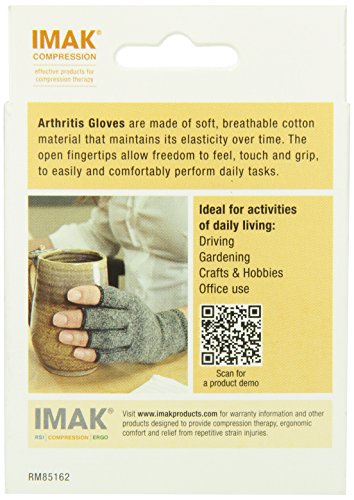 ReleaseDate : 2015-03-19 Studio : IMAK Publisher : IMAK Binding : Health and Beauty Product Description IMAK Arthritis Gloves are designed to help relieve aches, pains, and stiffness associated with arthritis of the hands. In addition to being designed by an orthopedic surgeon, IMAK Arthritis Gloves have also earned the Arthritis Foundation’s Ease of Use Commendation for its design. Read more about the commendation on the Arthritis Foundation’s web site.The unique design of the IMAK Arthritis Gloves provides mild compression for warmth and helps increase circulation, which ultimately reduces pain and promotes healing.The Arthritis Gloves are made of soft, breathable cotton material, meaning they are comfortable enough to wear all day and night. The open fingertips allow you complete freedom to feel, touch and grip, so you can perform daily tasks without issue. 0
