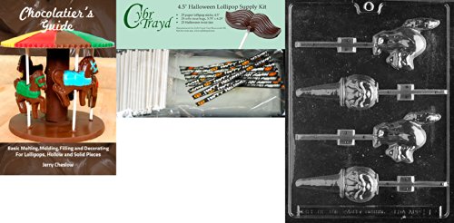 Cybrtrayd "Pumpkins and Cat Lollys" Chocolate Mold with Chocolatier's Bundle, Includes 25 Lollipop Sticks and 25 Cello Bags