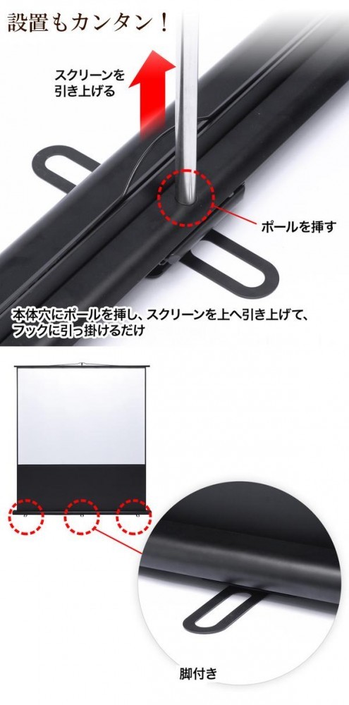 | 床置き式のプロジェクタースクリーンです。ポールを立てて引き出したスクリーンを掛けるだけで設置できます。スクリーンの高さや位置は調整可能!コンパクトに収納でき、ハンドル付きで持ち運びも簡単です。 |