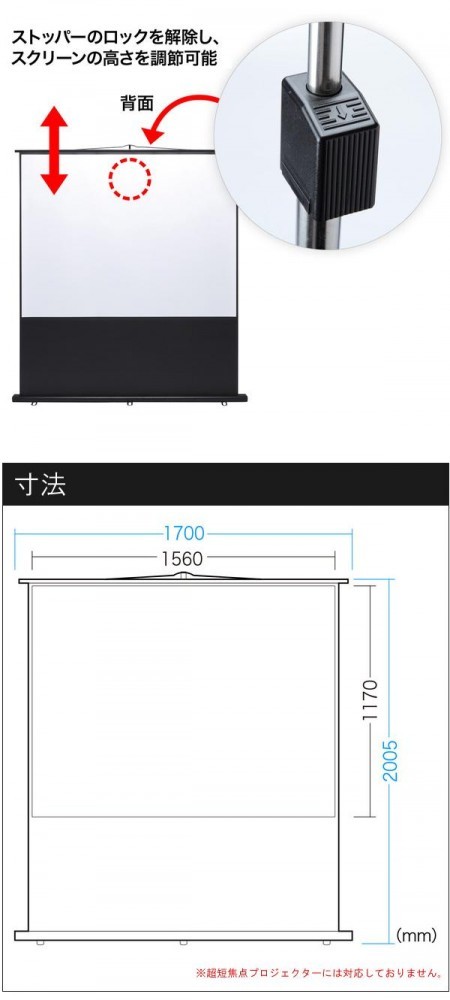 | 仕様 | スクリーン表示サイズ:W1560×H1170mm アスペクト比/4:3 対角線サイズ:80型相当 高さ1370~2010mmの間で調整可能 |