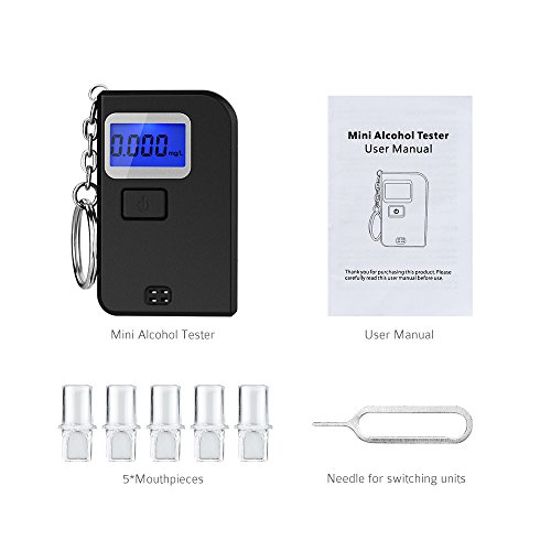 Note: 1. Please use the breath analyzer after 20 minutes of drinking. 2. Gargle before testing to avoid interference factor. 3. Please wait at least 3 minutes to begin next test after last test. 4. If there is any problem with the product, please contact us at first. We will provide solution for you. Pictek Keychain Breathalyzer is Worth Having 1. This portable breathalyzer is extremely light and portable, weights only 26g. With keychain design, you can take it along easily. 2. Upgraded breath analyzer. Folding mouthpiece design offer more accurate result; large LCD Backlight Screen display clearly and intuitively even at night. 3. This mini alcohol tester is powered by 1 AAA battery. With only one reset button, You can switch the units to �C/‰BAC/mg/L. Specifications: Sensor: High-precision Semiconductor Oxide Alcohol Sensor Detection range: 0.000 - 0.199% BAC (0.000 - 0.199% BAC or 0.000 - 0.995mg/L BrAC) Sensor accuracy: /-0.01% BAC(0.01% BAC or 0.1mg/L) Battery operated by 1*1.5V AAA batteries( Not Included ) Dimensions: 62 x38 x 15 mm Weight: 26g Package Included: Mini Alcohol Tester*1 Mouthpiece*5 Needle(for switching units)*1 User Manual*1 0